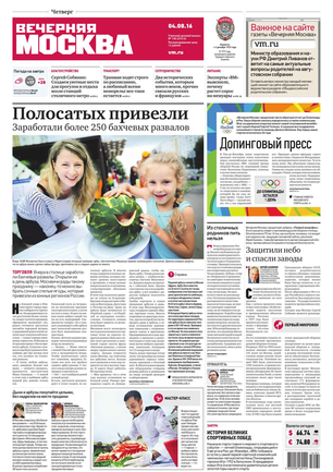 «Вечерняя Москва» — ежедневная российская вечерняя газета, старейшее из вечерних изданий в России, учрежденное в 1923 году. Выходит пять дней в неделю, кроме субботы и воскресенья. Отличается тем, что рассказывает о событиях еще не завершившегося дня. Оперативно освещает хронику и особенности жизни Москвы, охватывает все слои общества и большинство профессиональных и возрастных групп читателей.Издание представлено тремя выпусками – утренним ежедневным, вечерним (выходит три раза в неделю), еженедельным (выходит по четвергам).