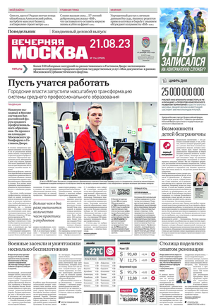 «Вечерняя Москва» — ежедневная российская вечерняя газета, старейшее из вечерних изданий в России, учрежденное в 1923 году. Выходит пять дней в неделю, кроме субботы и воскресенья. Отличается тем, что рассказывает о событиях еще не завершившегося дня. Оперативно освещает хронику и особенности жизни Москвы, охватывает все слои общества и большинство профессиональных и возрастных групп читателей.Издание представлено тремя выпусками – утренним ежедневным, вечерним (выходит три раза в неделю), еженедельным (выходит по четвергам).
