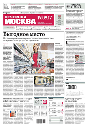 «Вечерняя Москва» — ежедневная российская вечерняя газета, старейшее из вечерних изданий в России, учрежденное в 1923 году. Выходит пять дней в неделю, кроме субботы и воскресенья. Отличается тем, что рассказывает о событиях еще не завершившегося дня. Оперативно освещает хронику и особенности жизни Москвы, охватывает все слои общества и большинство профессиональных и возрастных групп читателей.Издание представлено тремя выпусками – утренним ежедневным, вечерним (выходит три раза в неделю), еженедельным (выходит по четвергам).