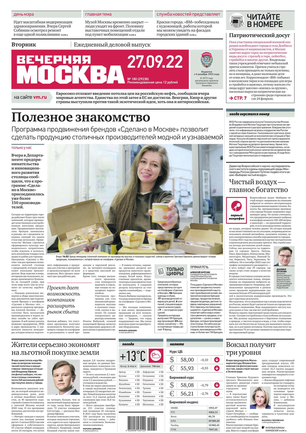 «Вечерняя Москва» — ежедневная российская вечерняя газета, старейшее из вечерних изданий в России, учрежденное в 1923 году. Выходит пять дней в неделю, кроме субботы и воскресенья. Отличается тем, что рассказывает о событиях еще не завершившегося дня. Оперативно освещает хронику и особенности жизни Москвы, охватывает все слои общества и большинство профессиональных и возрастных групп читателей.Издание представлено тремя выпусками – утренним ежедневным, вечерним (выходит три раза в неделю), еженедельным (выходит по четвергам).