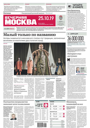 «Вечерняя Москва» — ежедневная российская вечерняя газета, старейшее из вечерних изданий в России, учрежденное в 1923 году. Выходит пять дней в неделю, кроме субботы и воскресенья. Отличается тем, что рассказывает о событиях еще не завершившегося дня. Оперативно освещает хронику и особенности жизни Москвы, охватывает все слои общества и большинство профессиональных и возрастных групп читателей.Издание представлено тремя выпусками – утренним ежедневным, вечерним (выходит три раза в неделю), еженедельным (выходит по четвергам).