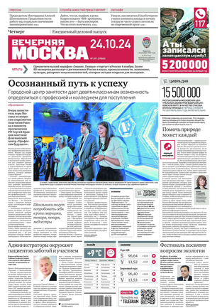 «Вечерняя Москва» — ежедневная российская вечерняя газета, старейшее из вечерних изданий в России, учрежденное в 1923 году. Выходит пять дней в неделю, кроме субботы и воскресенья. Отличается тем, что рассказывает о событиях еще не завершившегося дня. Оперативно освещает хронику и особенности жизни Москвы, охватывает все слои общества и большинство профессиональных и возрастных групп читателей.Издание представлено тремя выпусками – утренним ежедневным, вечерним (выходит три раза в неделю), еженедельным (выходит по четвергам).