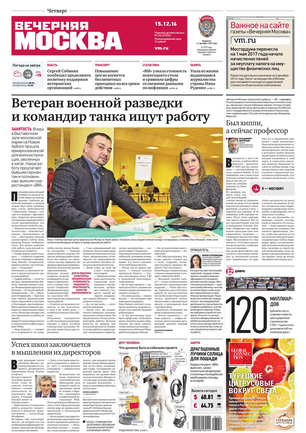 «Вечерняя Москва» — ежедневная российская вечерняя газета, старейшее из вечерних изданий в России, учрежденное в 1923 году. Выходит пять дней в неделю, кроме субботы и воскресенья. Отличается тем, что рассказывает о событиях еще не завершившегося дня. Оперативно освещает хронику и особенности жизни Москвы, охватывает все слои общества и большинство профессиональных и возрастных групп читателей.Издание представлено тремя выпусками – утренним ежедневным, вечерним (выходит три раза в неделю), еженедельным (выходит по четвергам).