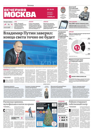 «Вечерняя Москва» — ежедневная российская вечерняя газета, старейшее из вечерних изданий в России, учрежденное в 1923 году. Выходит пять дней в неделю, кроме субботы и воскресенья. Отличается тем, что рассказывает о событиях еще не завершившегося дня. Оперативно освещает хронику и особенности жизни Москвы, охватывает все слои общества и большинство профессиональных и возрастных групп читателей.Издание представлено тремя выпусками – утренним ежедневным, вечерним (выходит три раза в неделю), еженедельным (выходит по четвергам).