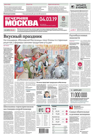«Вечерняя Москва» — ежедневная российская вечерняя газета, старейшее из вечерних изданий в России, учрежденное в 1923 году. Выходит пять дней в неделю, кроме субботы и воскресенья. Отличается тем, что рассказывает о событиях еще не завершившегося дня. Оперативно освещает хронику и особенности жизни Москвы, охватывает все слои общества и большинство профессиональных и возрастных групп читателей.Издание представлено тремя выпусками – утренним ежедневным, вечерним (выходит три раза в неделю), еженедельным (выходит по четвергам).