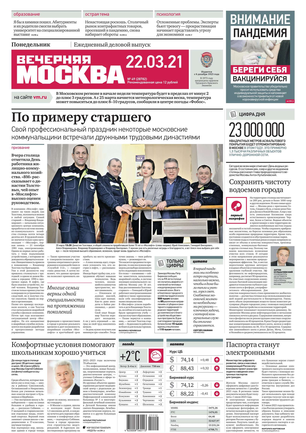 «Вечерняя Москва» — ежедневная российская вечерняя газета, старейшее из вечерних изданий в России, учрежденное в 1923 году. Выходит пять дней в неделю, кроме субботы и воскресенья. Отличается тем, что рассказывает о событиях еще не завершившегося дня. Оперативно освещает хронику и особенности жизни Москвы, охватывает все слои общества и большинство профессиональных и возрастных групп читателей.Издание представлено тремя выпусками – утренним ежедневным, вечерним (выходит три раза в неделю), еженедельным (выходит по четвергам).