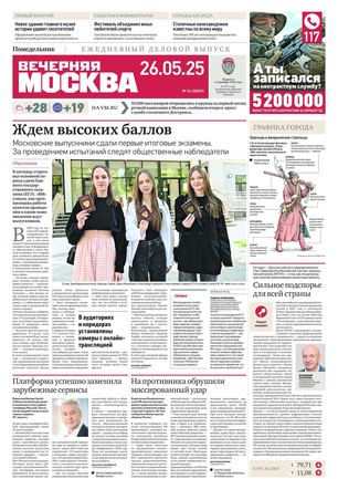 «Вечерняя Москва» — ежедневная российская вечерняя газета, старейшее из вечерних изданий в России, учрежденное в 1923 году. Выходит пять дней в неделю, кроме субботы и воскресенья. Отличается тем, что рассказывает о событиях еще не завершившегося дня. Оперативно освещает хронику и особенности жизни Москвы, охватывает все слои общества и большинство профессиональных и возрастных групп читателей.Издание представлено тремя выпусками – утренним ежедневным, вечерним (выходит три раза в неделю), еженедельным (выходит по четвергам).