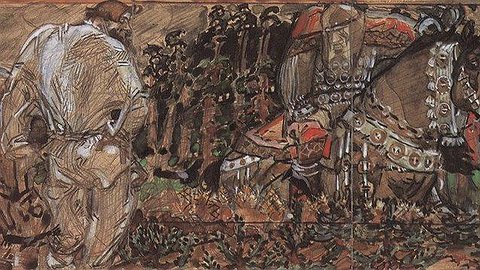 Следующий заход Врубель предпринял в 1896 г. К тому моменту положение его несколько упрочилось – в Москве он получал вполне достойные, хотя и не очень частые заказы, в основном касающиеся декора зданий. Но для статуса «настоящего художника» этого было мало. Он пробует пробиться на выставку передвижников с двумя работами. Одну вообще не допускают к экспозиции. Другую со скрипом выставляют, но лучше от этого не стало – в прессе её осмеивают. И вот наконец ему предоставляется отличный шанс. Всероссийская нижегородская выставка. Покровитель Врубеля, Савва Мамонтов, передаёт ему заказ на два монументальных панно. В кратчайший срок художник создаёт два шедевра – гигантские полотна «Принцесса Грёза» и «Микула Селянинович».