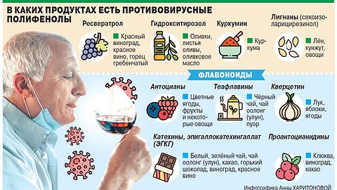«Ресвератрол – сильный антиоксидант, защищающий от многих заболеваний. Хорошо известны и его противовирусные свойства, – рассказывает профессор, доктор химических наук, научный консультант компании «Интерлаб» Яков Яшин. – Но активность против вирусов есть и у многих других антиоксидантов, содержащихся в продуктах и напитках. В первую очередь таким действием обладают полифенолы. Мы много лет изучаем эти вещества и подготовили сейчас научный обзор по антиоксидантам с таким действием (см. инфо­графику). Они могут быть полезны химикам и фармакологам при создании новых лекарств против возбудителя COVID-19 и других вирусов.