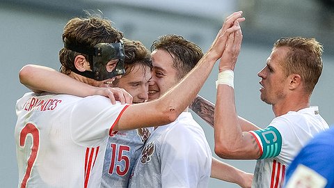 Россия: 99. Лунев, 5. Нойштедтер, 6. Шахов, 14. Кутепов, 2. Мариу Фернандес (20. Игнатьев, 71), 23. Тарасов (к) (9. Могилевец, 62), 17. Ант.Миранчук (24. Швец, 76), 7. Кузяев, 15. Ал.Миранчук (10. Митришев, 68), 21. Рауш (4. Чернов, 71), 11. Заболотный (8. Панченко, 55).