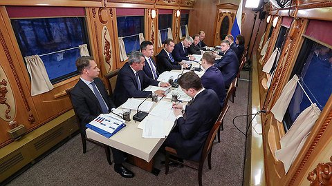 С коллегами-журналистами идем в пятый вагон. Там Медведев проводит совещание по развитию железных дорог. Для совещания отвели вагон-ресторан. Вот только выглядел он внутри совсем не типично. Посередине поставили большой длинный стол, за который уселись чиновники. Стены украшены резными деревянными панелями. Кстати, этот же вагон использовали для совещания Медведева в 2012 году. С тех пор только шторы на окнах сменили: тогда были пафосные бордовые с бахромой. Теперь вместо них - жалюзи. И дополнили их скромными белыми занавесками.