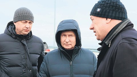 На мосту было ветрено. Президенту рассказали о ходе работ... «Докладывали каждые 12 часов... Штаб работал круглосуточно... Уложен асфальтобетон... Поставлены барьерные ограждения... Принимались неклассические инженерные решения, позволившие сократить сроки строительства и завершить строительство раньше срока...»